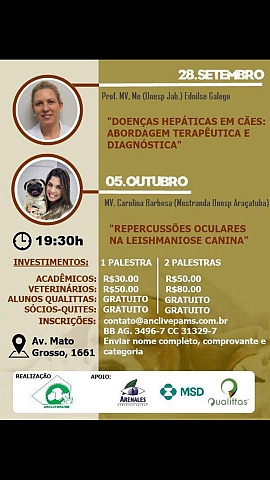 Dia 28/09 a Profª. MV. Me. Ednilse Galego ministrará a palestra "Doenças Hepáticas em cães: Abordagem Terapêutica e Diagnóstica" e no dia 05/10 a MV. Carolina Barbosa ministrará a palestra" Repercussões Oculares na Leshmaniose Canina".